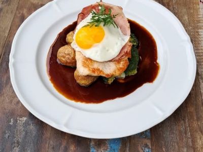 250g. Grilovaná vepřová kotleta s kostí, šunka, sázené vejce, americké brambory