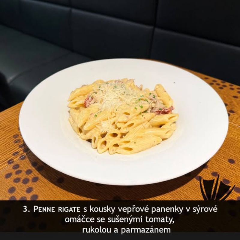 Penne s vepřou panenkou, rajčata, česnek, cuketa, smetana, parmazán rukola A (1, 3, 5, 7) 1357