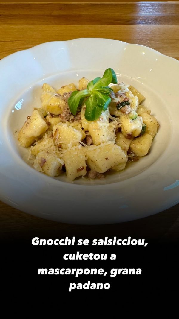 Gnocchi fatti in casa al ragù di cervo Noky se zvěřinovým ragú na červeném víně, kořenová zelenina a parmazán