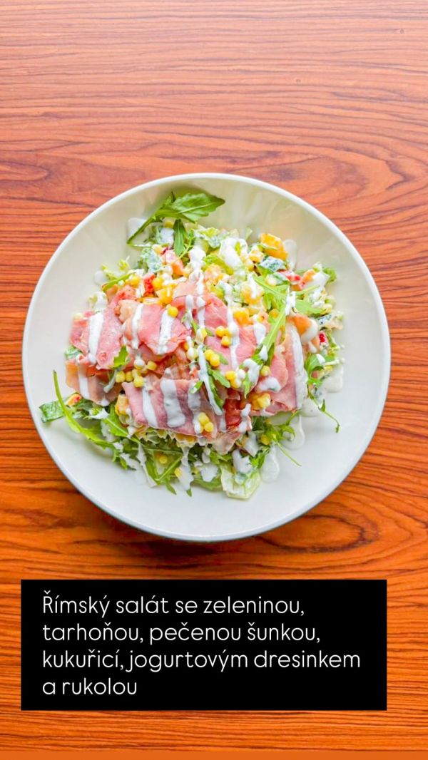 Francouzské brambory s uzeným masem, vejci a hráškem zapečené, s pikantním zelným salátem 3,7