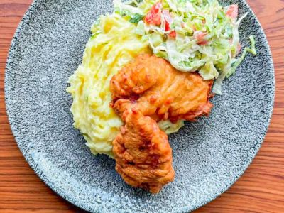 Uzené kuřecí stehno, bramborová kaše, okurkový salátek 7