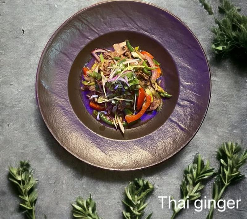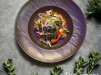 Marinovaná vepřová panenka „Teriyaki“ podávána za studena se zeleninovým salátem, wasabi dresinkem a opečenou bagetou romana