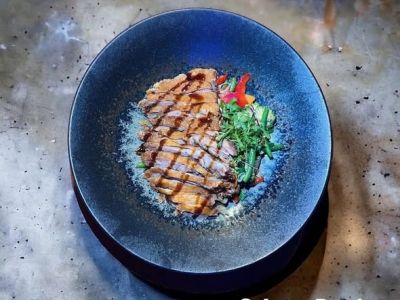 Marinovaná vepřová panenka „Teriyaki“ podávána za studena se zeleninovým salátem, wasabi dresinkem a opečenou bagetou romana