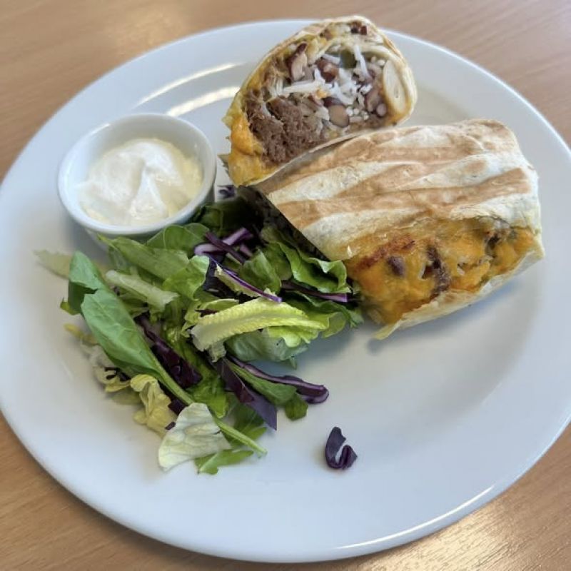 Quesadilla con verdura - tortilla plněná fazolemi, grilovanou cuketou, cibulí, paprikou, sýrem gouda, čedar a balkánským sýrem, podává se s nachos a salsou mexicana