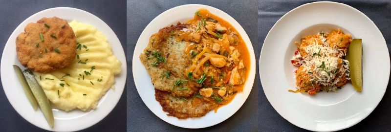 150 g smažený kuřecí řízek, brambory 190. - Kč