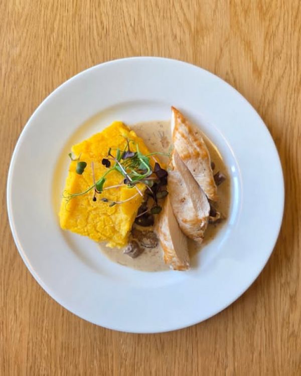 Pečené kuřecí prso na divoko, listový špenát na česneku, bramborové knedlíky