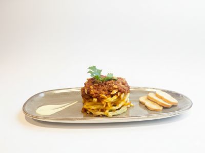 70gSteak z vepřové pečeně s bylinkami ve střívku, rajčatové rizoto s lilkem, majoránkové glazé