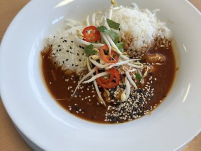 Sojové kostky s arašídovou omáčkou, zelenina, jasmínová rýže, koriandr