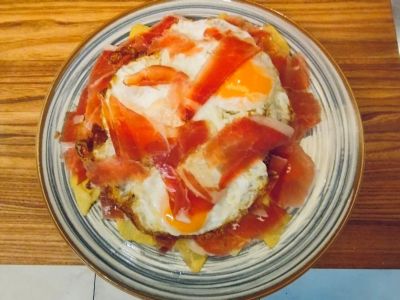 Langoš z kynutého bramborového těsta s trhanou vepřovou plecí, listy salátu, rajčaty a strouhaným balkánským sýrem 136710