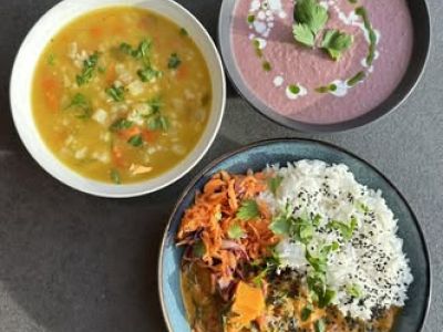 Bio ječné kroupy, dušená zelenina s dýní, restovaná cizrna na paprice, bio přeliv, salát s extra panenským olivovým olejem
