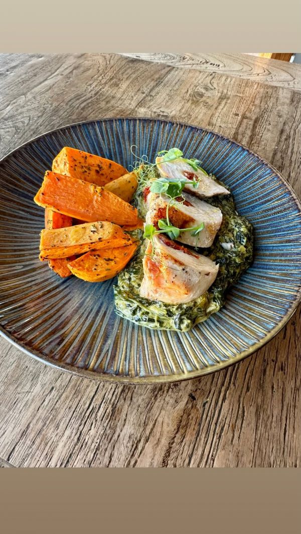 Kuřecí steak, omáčka z pečených paprik, pečené Grenaille