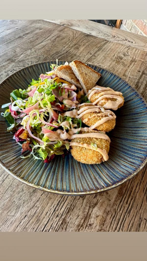 Plátky uzeného norského lososa podávané na zeleninovém salátu s vařeným vejcem a avokádem, hořčično-medový dresink s koprem, opečená bagetka 1347