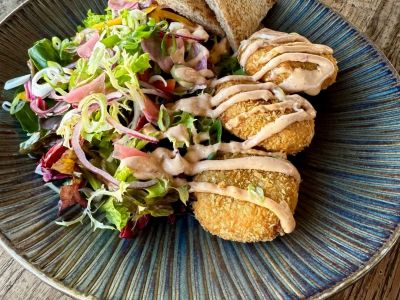 Smažená mozzarella plněná italským jemně pikantním salámem Ventricina, obalená v panko strouhance, podávaná s vařenými brambory a domácí tatarskou omáčkou