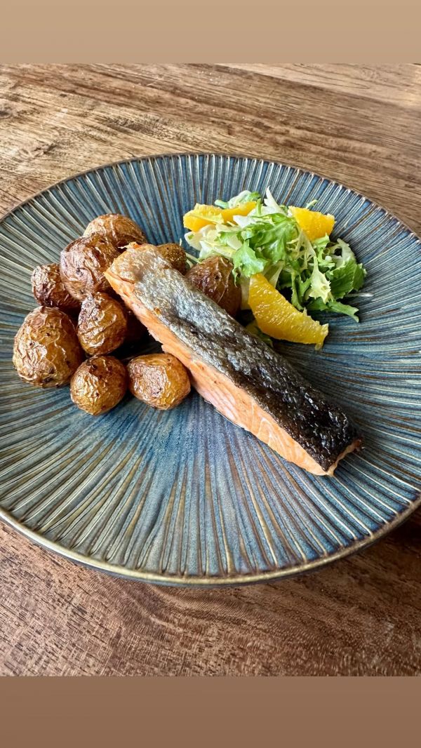 Tortilla Salmone - trhaný losos marinovaný v pomerančové šťávě a chilli, baby špenát, římský salát, okurka, cherry rajčata a hořčično-koprový dresing, servírovaná s pečenými bramborami a jogurtovým dipem s limetami