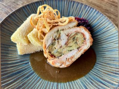 Kuřecí roláda po selsku, bramborová kaše, zeleninový salát 1379