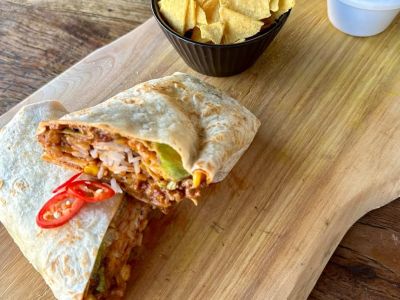 1ks Wrap s trhaným věpřovým ramínkem, BBQ omáčkou, saláty, chedarem a zeleninou, chilli majoméza, hranolky 259 137691012