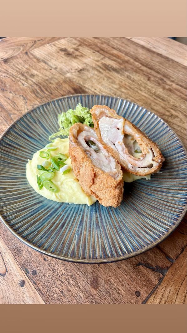 160g Kuřecí Cordon Bleu se šunkou a sýrem gouda, nakládaná okurka, máslová bramborová kaše