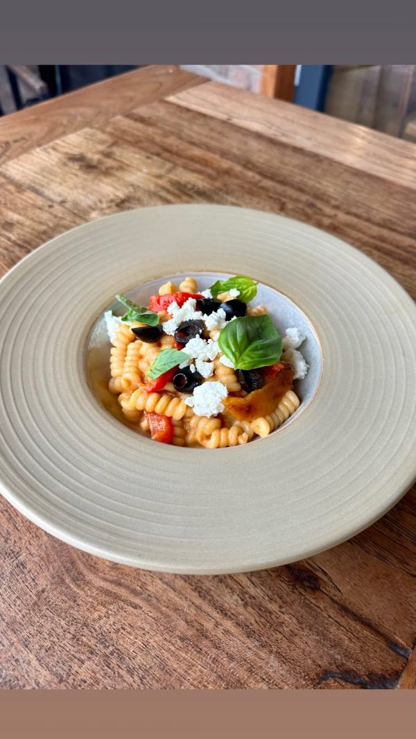 Fusilli al forno con formaggio di capra - čerstvé fusilli zapečené s kozím sýrem, pancettou, červenou cibulkou, smetanou a brusinkami