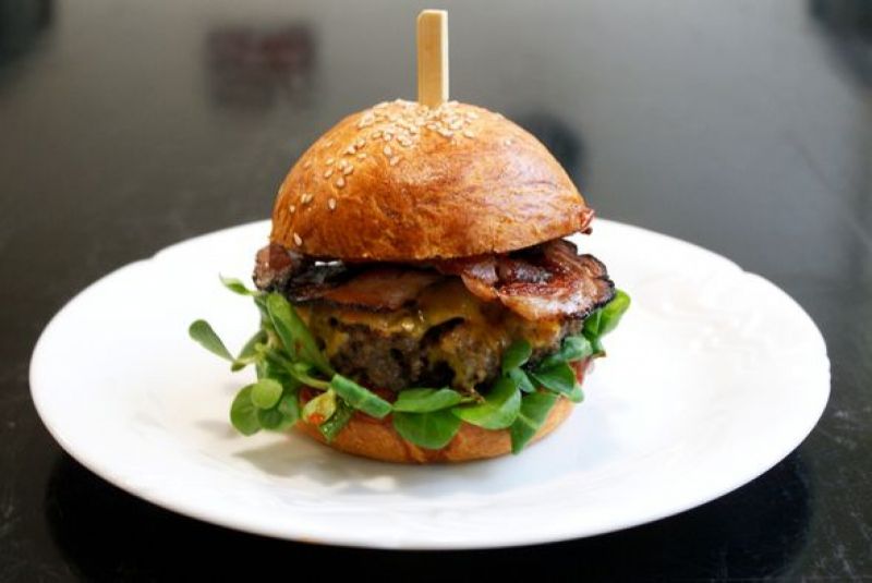 200g Mikulášský Burger (hovězí Chuck roll, pepřová majonéza, sušená rajčata, slanina, salátek, domácí bulka), malé hranolky