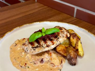 Kuřecí steak s pepřovou omáčkou /7, 9, 10/ opékačky