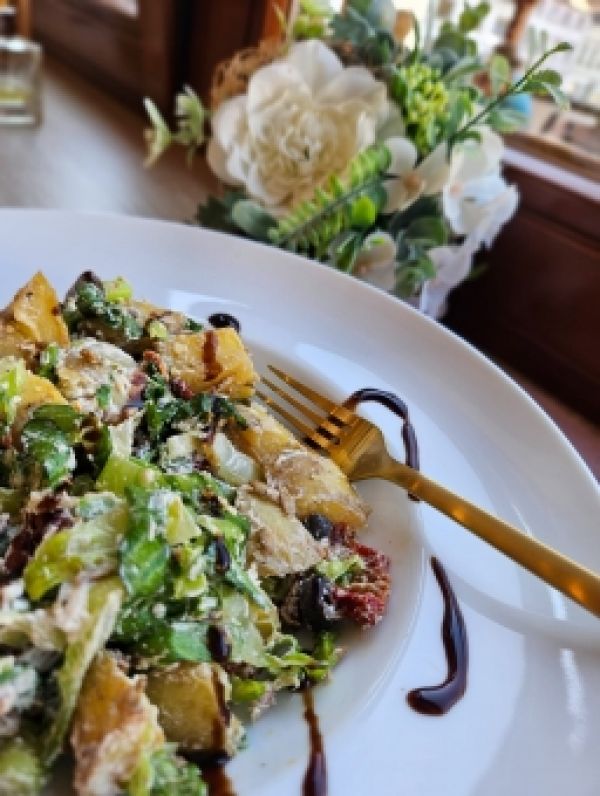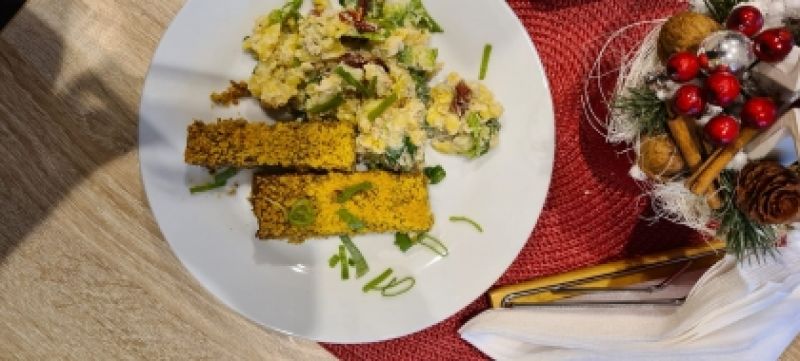 450g Myslivecké brambory zapečené se slaninou, žampiony spojené mlékem a vejci, okurka 37