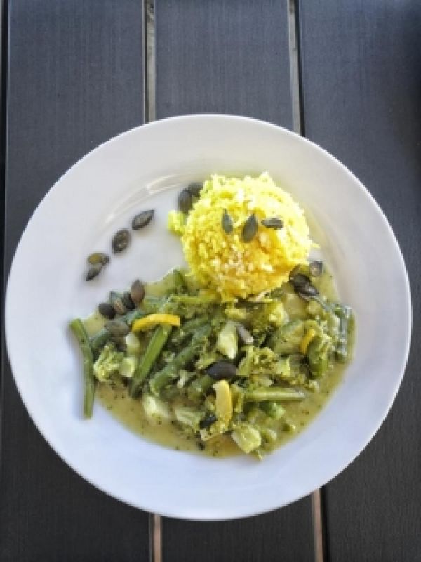 120g Kuřecí kousky se smetanovou kari omáčkou (smetana, víno, cibule, kari), těstoviny 171