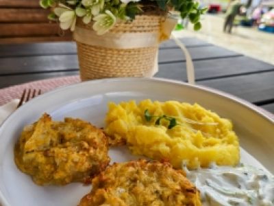 Celerové placičky se sýrem, bramb. kaše, zelný salát se smetanou 145 Kč
