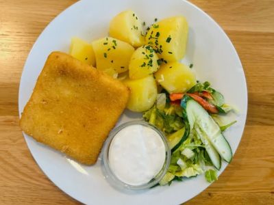 Přírodní sekaný řízek se sýrem, vařený brambor, tatarská omáčka / bramborový salát