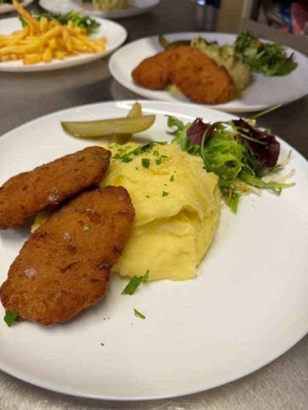Vepřový řízek XXL, zalitý tatarkou, sypaný sýrem, krokety, zelný salátek
