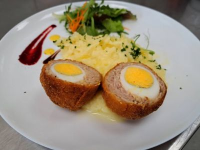 150g RIB EYE steak, demi glace, volské oko a farmářské brambory