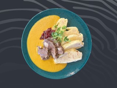 Pečená kachní čtvrtka, červené zelí chlupatý knedlík