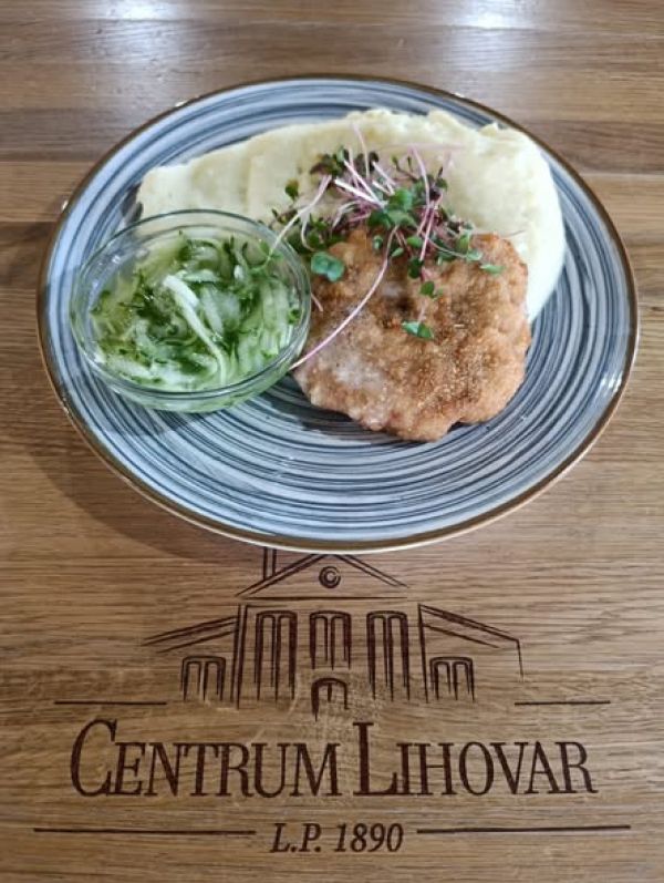 150g Mletý řízek se sýrem, bramborová kaše, okurka 1. 3. 7.