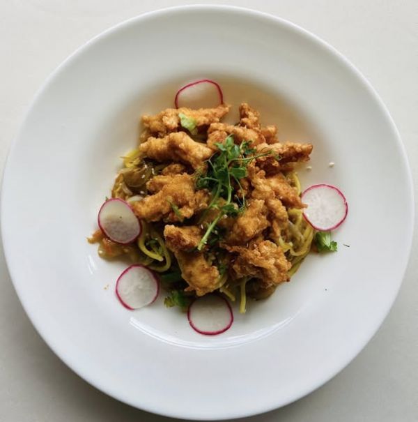 Norský losos s pistáciovou krustou, podávaný s bramborovými grenaille a limetovým dipem