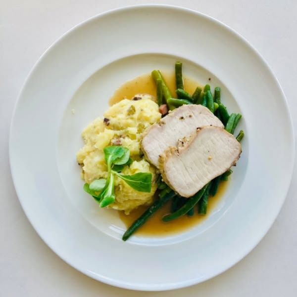 150g vepřová panenka plněná špenátem, bramborová kaše 1, 7, 9