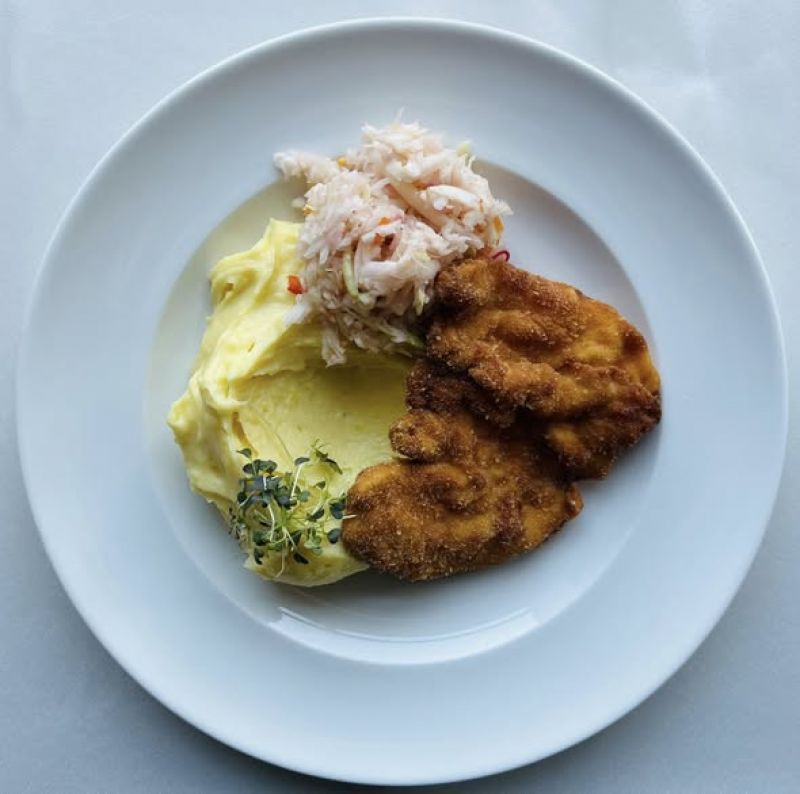 Loštický sekaný řízek, šťouchané brambory