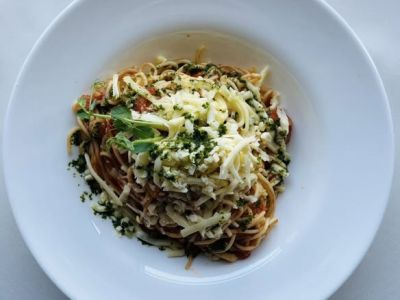 350gr Špagety s rukolou, chilli papričkami a balkánským sýrem (vege)