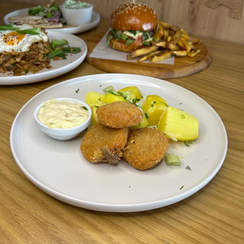 Obalovaný květák, vařený brambor, salátek, tatarka