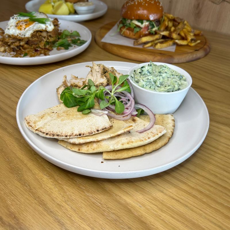 Pečený bramborák plněný zeleninou s kuřecím masem, smetanový dip