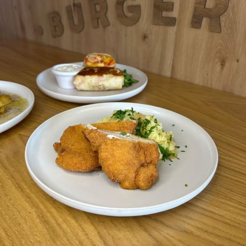 Smažený sýr se šunkou, brambor / hranolky / tatarská omáčka