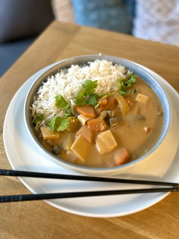Kuřecí prsa v omáčce s červeným curry, brokolice, rýže Basmati, koriandr, chilli 7