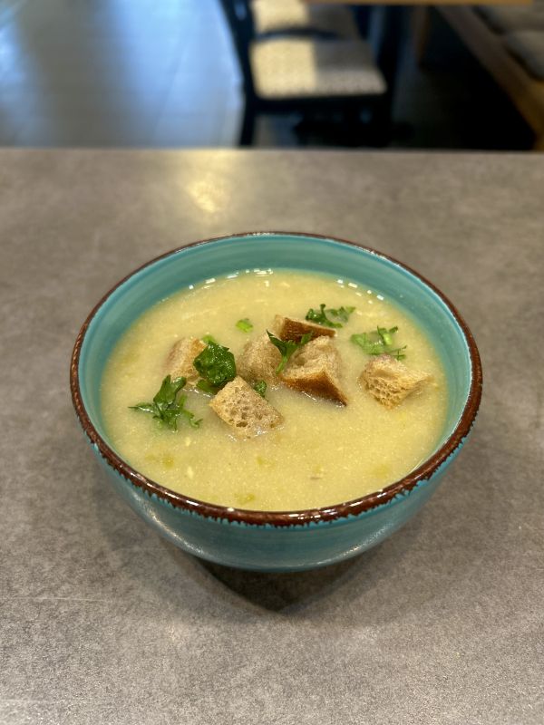 Polévka + Kuřecí steak na rokfórové omáčce, br. krokety