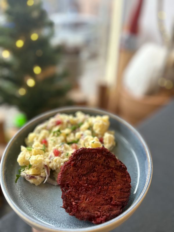 Smažený karbanátek se sýrem, bramborová kaše, mrkvový salát