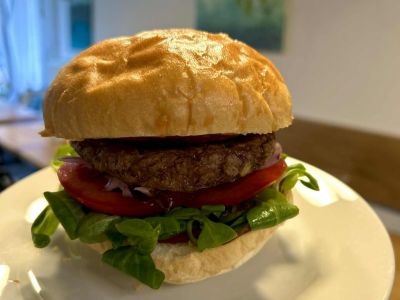Šnyt burger (vyzrálé h. maso, slanina, čedar, salát, rajče, bulka, kečup, hranolky)