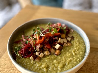 1. Polévka + Kuřecí steak na restované zelenině, krokety