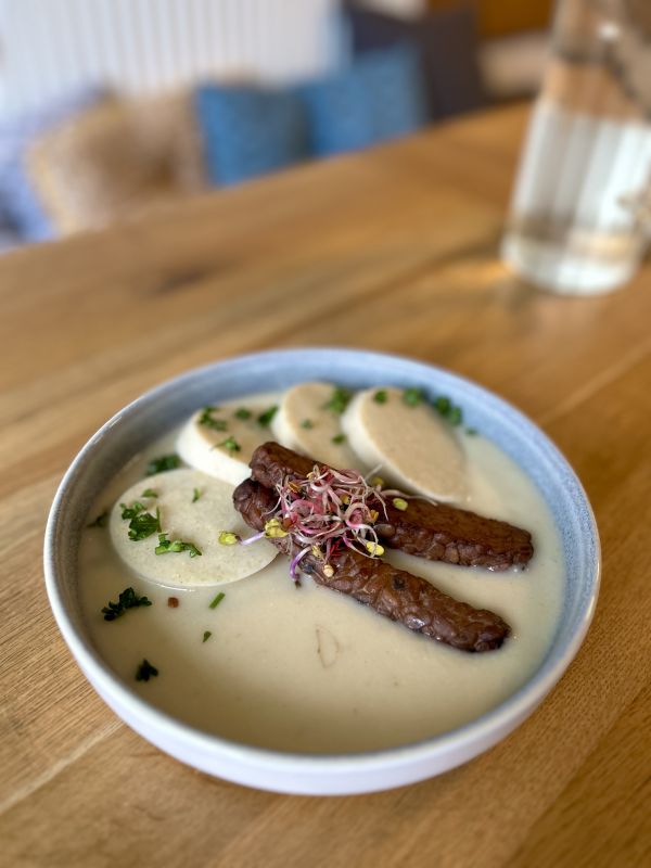 Polévka + Gnocchi s v. panenkou, smetana, listový špenát