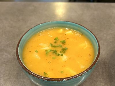 3. Polévka + Tortilla plněná grilovaným kuřecím masem, zeleninou, sýrem, bylinkový dip