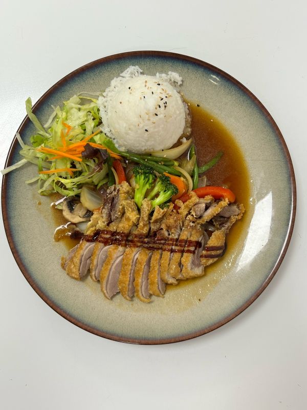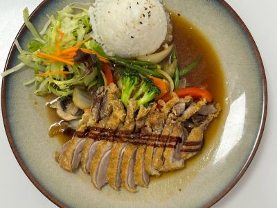 Marinovaný vepřový bok po asijsku podávaný na vlažném salátu z barevné čočky se zeleninou a silnou šťávou z výpeku s hoisin sweet chilli