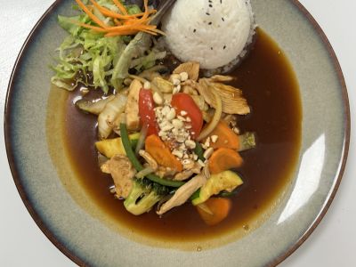 150g Filírovaná vepřová kotleta podávaná s pečenou zeleninovou rýží s čerstvým koriandrem a sezamem a naší sweet-chilli teriyaki omáčkou 188, -/225, -