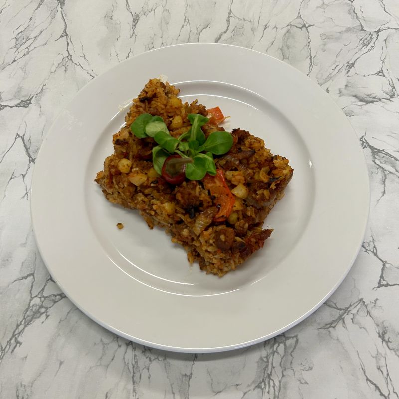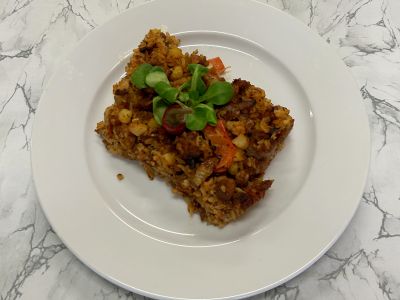 100g Hovězí pečeně zbojnická, dušená rýže (h. zadní, slanina, cibule, česnek) 1