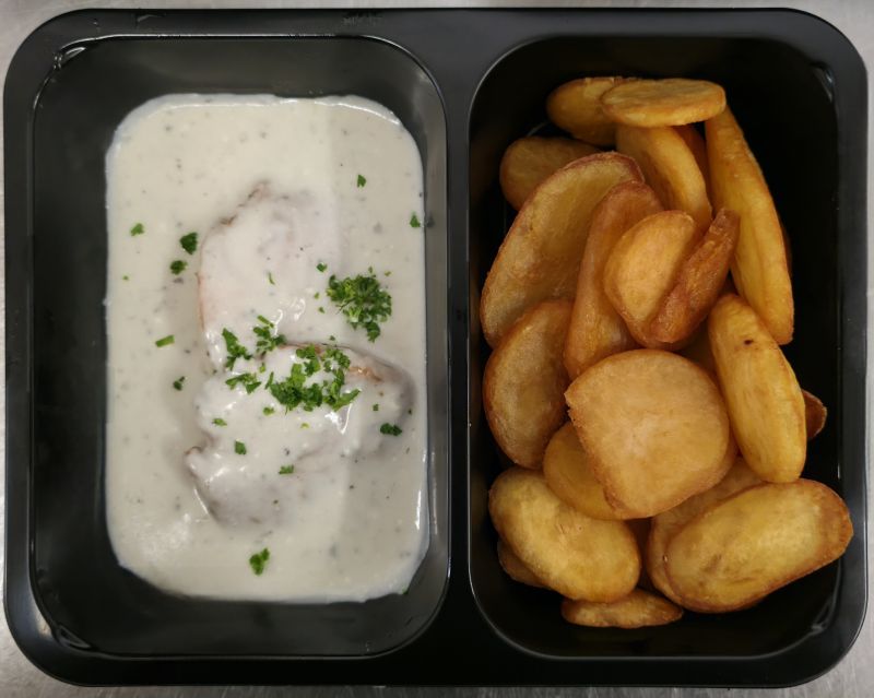 150g Rybí filé po pekařsku (rybí filé pečené s plátky brambor a žampionů) 479